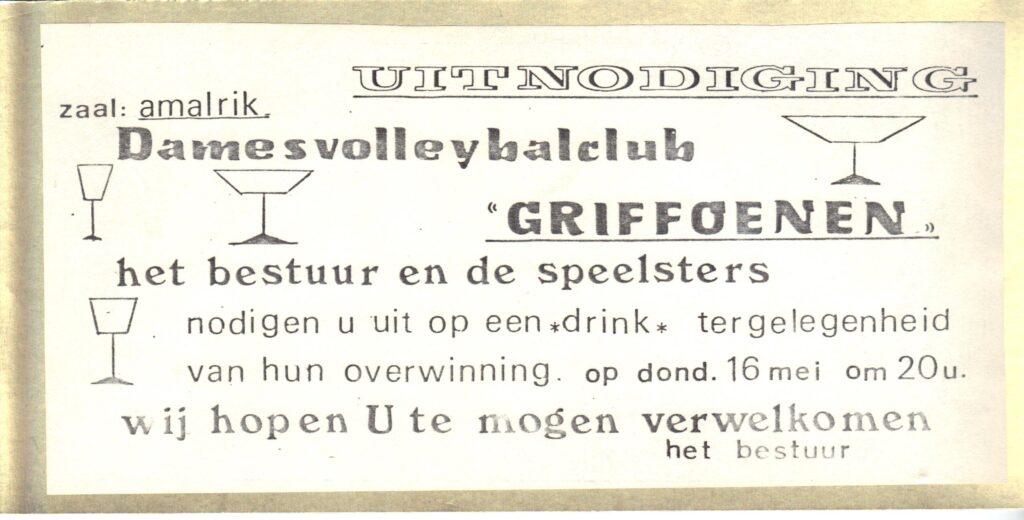 Tijdens de Meikermis werd een eerste tornooi georganiseerd, en al gauw ontstond er een vaste ploeg. Op 2 augustus 1968 volgde de officiële aansluiting bij de volleybalbond, en kreeg de club zijn naam: Griffoenen, op voorstel van burgemeester G. Haelterman. De kleuren geel en blauw werden gekozen.